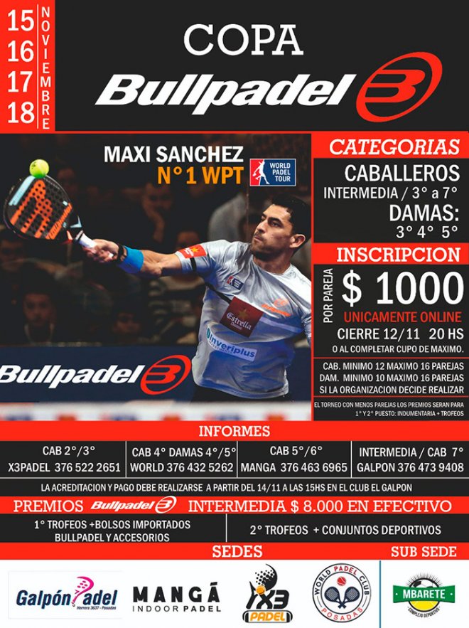 »» Evento: Copa Bullpadel Noviembre 2018 »» Localidad: Posadas »» Fechas: 15/11/2018 al 18/11/2018