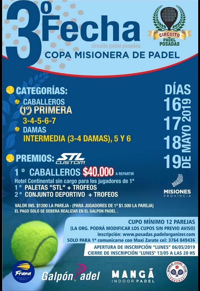 »» Evento: 3ra Fecha Circuito de Padel Posadas »» Localidad: Posadas »» Fechas: 16/05/2019 al 19/05/2019